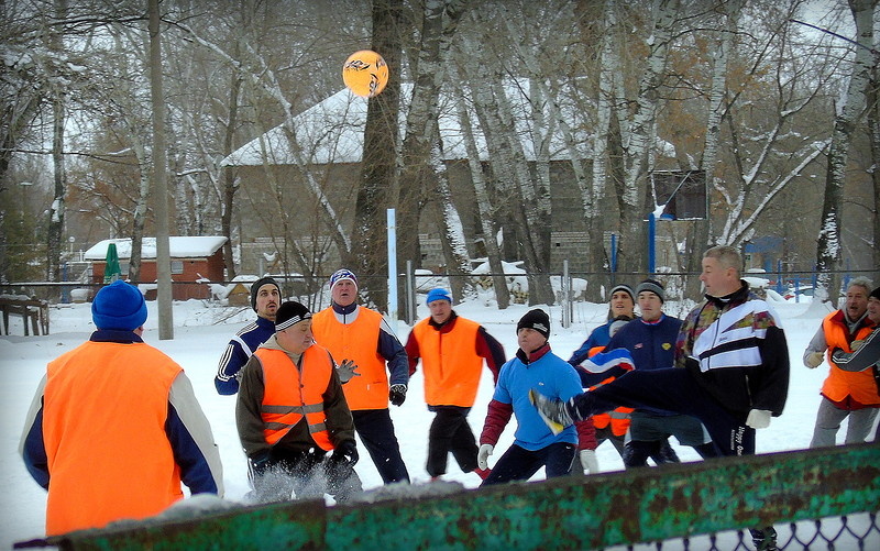 Чего только не встретишь в любимой оренбуржцами Зауральной роще Идешь так на лыжах по Зауральной роще, кругом белым бело, вдруг, вдали появляются яркие оранжевые точки, как апельсины на снегу:-) То мужики играют в футбол, чтобы тело и душа были молоды:-) А чтобы различать свою команду, надели оранжевые жилеты. И остановишься поболеть за играков. С детства помню, как на этих спортивных площадках играли в футбол или волейбол и летом и зимой. и чаще всего, именно взрослые люди играли, а мы, дети, болели за оградой:-)