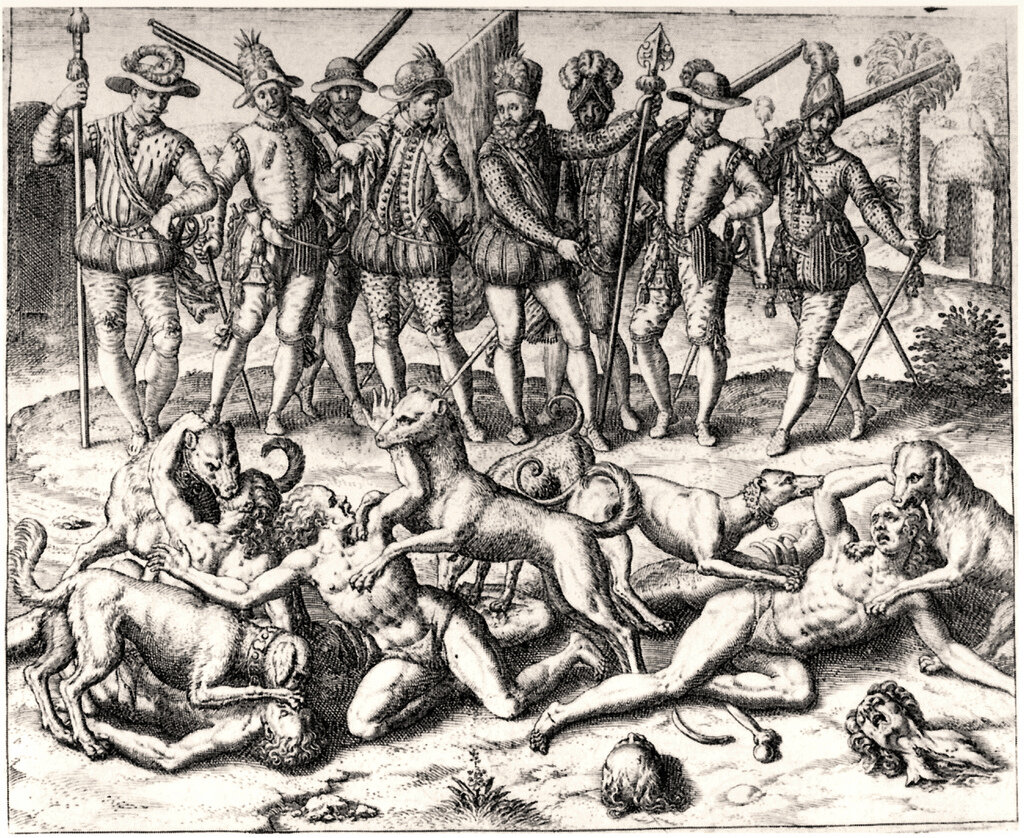 Собаки не всегда являлись лучшими друзьями человека, по крайней мере, не для всех. Об этом могут свидетельствовать некоторые коренные народы Америки, которым приходилось сталкиваться с ними на поле битвы. Ведь собаки до того, как стать полицейскими, ищейками бомб или наркотиков, были воинами. Точнее, они были воинами вместе с первыми испанцами на американском континенте. Ужасные боевые псы Аланы были кочевым племенем иранского происхождения, которые поселились в Испании в V веке нашей эры, в рамках миграции так называемых «варварских» народов. С ними появилась собака, достаточно мощная, используемая как в сражения, так и в животноводстве. Порода этих собак известна как «alaunt», позднее трансформировалась в испанский алано. Эта собака запечатлена даже на гравюрах Гойи. Первое свидетельство о присутствии этой породы в Америке и выполнении ею военные функции, находится в записях Бартоломео Колумба, младшего брата Христофора Колумба – первооткрывателя Америки. Бартоломео был Аделантадо и