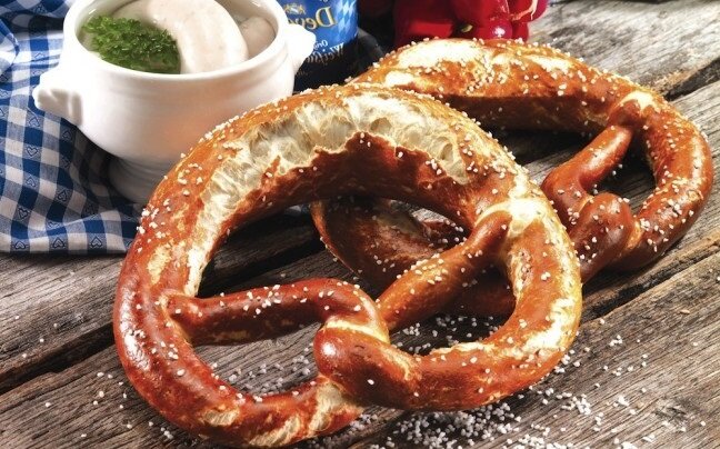 В Германии очень популярен "бублик". По немецки он называется брецель. Его пекут постоянно, дома и в пекарнях. Подают к супу, к пиву и просто так - на перекус. Его форма более сложна по сравнению с нашим бубликом, как вы видите на фото. Это скорее крендель. Выпекается из дрожжевого теста, не требующего длительной расстойки — замесил и пеки. В Германии по традиции этот бублик-крендель посыпается обильно крупной солью или натёртых сыром. Возьмите рецепт в закладки на моем сайте "Германия из первых рук". Рецепт на 1 кг муки. Для приготовления немецкого бублика-кренделя, он же брецель требуется: Мука - 1 кг Вода теплая - приблизительно 2 стакана Дрожжи - 40 гр Масло сливочное или топленое - 80 гр 2 чайные ложки сахара 1 чайная ложка без верха для теста Крупная соль для присыпки или натёртый сыр для присыпки Также нужна пищевая сода - см далее для чего. Изготовление таково: Сначала заместитель тесто. Для этого в миску нальём воды как указано Она должна быть примерно 40 градусов,