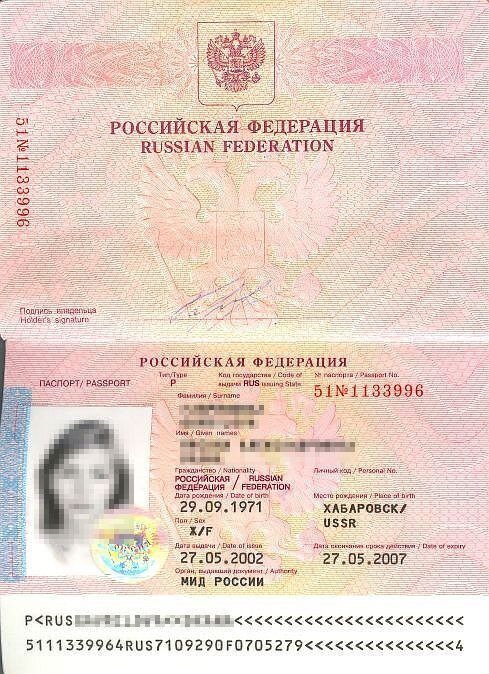 «Машиносчитываемая зона» - во внутреннем паспорте РФ появилась только с 1 Июля 2011 года. Данная зона предназначена для считывания данных паспорта системами оптического распознавания символов. Состоит из двух строк, заполненных латинскими буквами, арабскими цифрами и специальным знаком-заполнителем «<», заменяющий пробел. Другие знаки и символы не допускаются. Первая строка начинается с двух букв «PN» (Passport National), далее следует «RUS» - трехбуквенный код Российской Федерации. Оставшееся место в верхней строке занимают фамилия, имя, отчество в именительном падеже. Нижняя строка начинается с трёх первых цифр серии и шести цифр номера паспорта. Далее следует контрольная цифра и указание на гражданство - заглавные буквы «RUS». Потом идет информация о дате рождения: по две цифры на год, месяц и день. Если не известны день и (или) месяц рождения, в соответствующих позициях указывается 0. Затем идет контрольная цифра и пол владельца паспорта: «F» - женский, «M» – мужской. Следующие 6 знаков – это дата истечения срока действия паспорта.