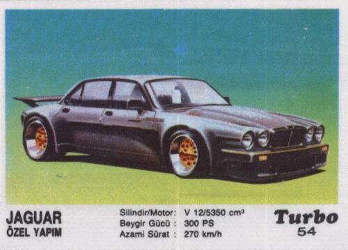 Этот вкладыш я впервые увидел в жаркий день середины лета 1990 года. Даже по сегодняшним меркам этот Ягуар выглядит очень круто с экстремально низким обвесом, крылом сзади и этими удивительными серебристо-золотистыми дисками. Что уж говорить о том времени, когда простая Лада ‘восмерка’ еще смотрелась довольно свежо. Тогда мне удалось быстро выменять вкладыш, и я больше с ним не расставался. Сама суть ностальгии очень хорошо ощущается в Турбо #54. Одевая классический Ягуар в такой обвес, ты тащишь его с собой, не давая стать наследием прошлого. Сохраняя старый вкладыш или смотря на его скан, ты не хочешь отпускать жаркий летний день того времени, когда все вокруг было новым и ярким, потому что тебе самому было всего 9. И это не прлохо и не хорошо. Главное, чтобы кроме прошлого было полноценное настоящее и будущее. О машине. Загадочный «Jaguar Özel Yapim». Словосочетание «Özel Yapim» не выглядит достаточно пристойным или вообще сносным для того, чтобы быть названием автомо