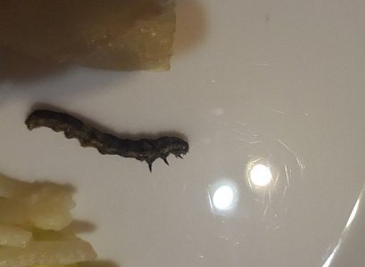 «Сегодня в «Глобусе» купила салат «Цезарь». Когда съела половину, увидела черную гусеницу. Представьте мое состояние. Она конечно милая, но несъедобная», — написала автор поста. Фото из соцсети