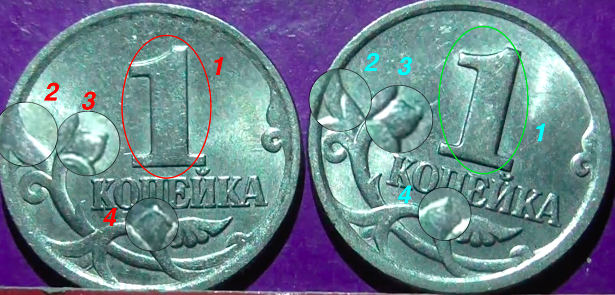 В рубрике современные дорогие монеты, сегодня будем говорить о 2004 годе. Здесь тоже есть редкие экземпляры, которые очень дорого стоят. 1 копейка 2004 года С-П Первая монетка — копейка, достаточно редкая монета и очень интересная. Рассматривать её будем путем сравнения с обычной монетой этого же года. Нам нужно найти всего 4 ярких отличия. 1. Рельеф чеканки цифры 1 более глубокий. 2. На листе обозначенном цифрой 2 присутствует глубокий срез. 3. Окантовка бутона (позиция 3) слабо проглядывается. 4. На нижнем бутоне (№4) окантовки тоже практически нет. Есть еще много отличий, но по этим четырем признакам вы уже на 90% будете знать, что вам попалась дорогая монета 2004 года. Стоит она от 4000 рублей. Номер штемпеля — 2.2. 1 копейка 2004 года М Здесь нас интересует два экземпляра — штемпель «Б» и штемпель «В». Отличий у них не много. Особое внимание будем уделять поводьям и тому, как расположена буква М (Московский монетный двор) У рядовой монеты одни поводья и буква М расположена не пар
