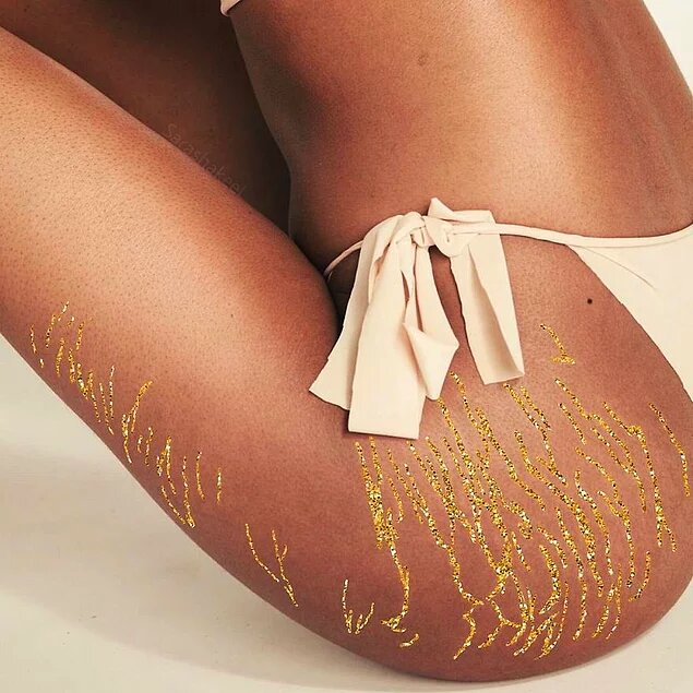 1. «Кинцуги» — японское искусство реставрации керамики 2. Согласно ему, поломки и трещины — это часть истории объекта 3. А значит их не нужно скрывать, а напротив подчеркивать с помощью лака и золотого и серебряного порошков 4. Пакистанская художница Сара Шакил взяла это искусство за основу для своего проекта 5. Она хочет доказать женщинам, что они не должны стесняться своих растяжек 6. Сара просит своих подписчиков отправить ей фото с растяжками 7. И превращает их в нечто прекрасное, «покрывая» их блестками 8. А в этом что-то есть...