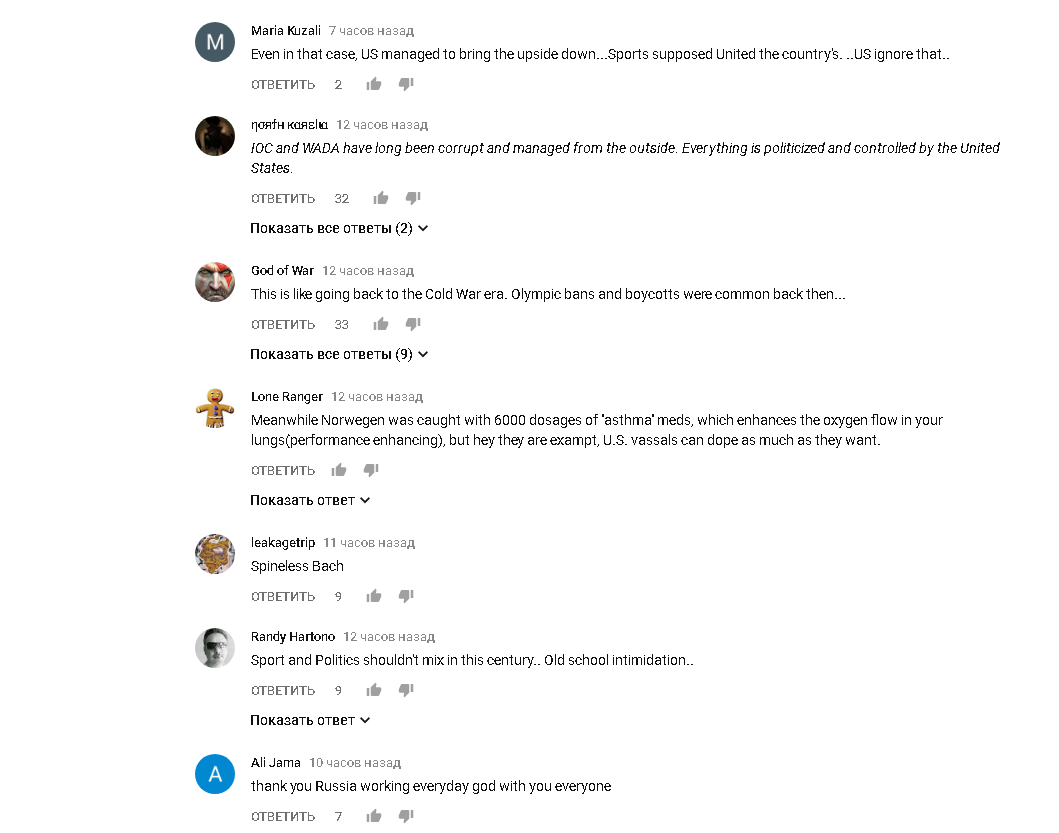 "Даже в таком случае США перевернули все с ног на голову...Спорт должен объединять страны. .. США по- фиг это..", " МОК и ВАДА уже давно коррумпированы и управляются извне. Все политизировано и контролируется Соединенными Штатами.", "Это как вернуться в эпоху "холодной войны". Тогда были распространены Олимпийские запреты и бойкоты...", " Между тем норвегам было взято 6000 дозировок мед.преп. от "астмы", которые увеличивают подачу кислорода в ваши легкие, но Эй, они же, вассалы США, могут допинг принимать по мере того, как им это необходимо.", "Бесхребетный Бах", "Спорт и политика не должны смешиваться в этом столетии.. Старая школа запугивания..", "Спасибо Россия, Бог всегда с вами"- постами такого содержания пестрит лента комментариев к видео с англоязычным переводом "МОК ДИСКРЕДИТИРОВАН: МОК отказывается приглашать россиян на зимние Олимпийские игры в Пхенчхане".