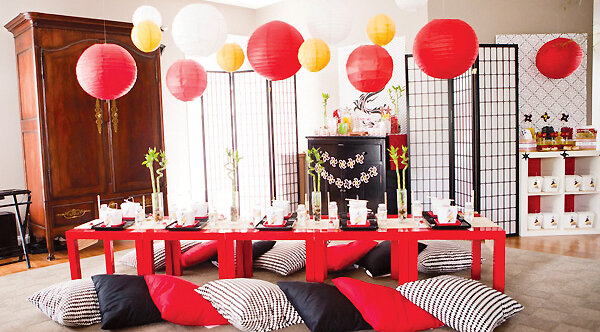 Оформление помещения Можно использовать любой декор, лишь бы украшение помещения ассоциировалось с Азией. Подойдут картины с изображением природы, городских пейзажей, низкий столик с вазой, фигуркой дракона, различными статуэтками. Романтичность атмосфере придадут плавающие в воде свечи, ветка сакуры и/или хризантемы, ароматические лампы. Обязательными элементами должны стать приглушенный свет и этническая музыка. Наряд И организаторам, и гостям стоит облачиться в белоснежные кимоно, представительницам прекрасного пола пригодятся яркие юбки в качестве низа. Если кимоно нет, намотайте длинный отрез ткани, чтобы получились широкие рукава, а дальше под грудью вокруг себя. Скрепить концы поможет брошь, а в роли пояса выступит шарф. В качестве альтернативы берут шелковые восточные платья, блузы. Прическа и макияж Для создания симпатичного пучка на голове подойдут обычные палочки, которыми едят суши, естественно, новые и не использованные. В качестве декора хороши цветы или небольшие фигур