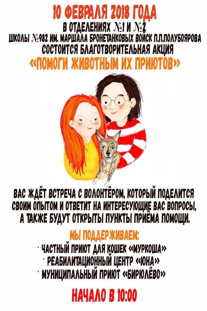 В эту субботу, в рамках межрайонного фестиваля "Наши общие возможности - наши общие результаты", наши маленькие друзья, ученики школы № 982, проведут благотворительную акцию помощи приютам для бездомных животных.