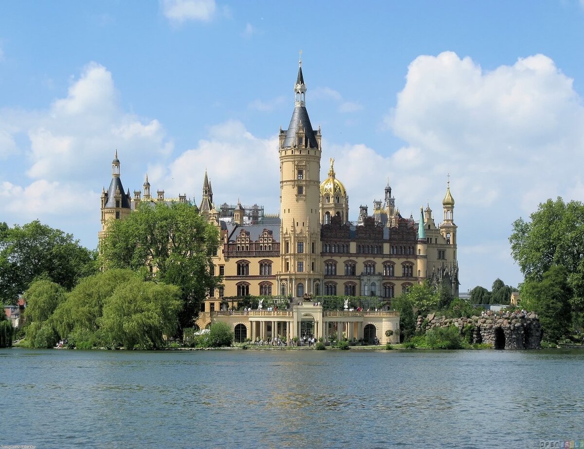 Замок на севере Германии, в городе Шверин - бывшая резиденция великих герцогов Мекленбурга, расположен на живописном острове посреди Шверинского озера, в центре города. Замок располагается на Дворцовом острове, который соединяется с городом и дворцовым садом двумя моста. Зданий на этом месте было построено несколько: сначала была древняя славянская крепость X века Зверин (965 год), потом при герцоге Магнусе II (1477 - 1503) был построен «Великий Новый дом», старейшая из дошедших до наших дней частей замка. В 1553-1555 годах при герцоге Иоганне Альбрехте I «Великий Новый дом» был перестроен в ренессансном стиле и отделан терракотовой плиткой. Эта отделка сохранилась до наших дней со стороны фасада замка, выходящего на озеро. Шверинский замок в его современном виде был построен по заказу Великого герцога Фридриха Франца II в 1845 - 1857 годах в стиле романтического историзма, предполагающем сочетание различных исторических архитектурных стилей, прооброзом служил французский замок Ш