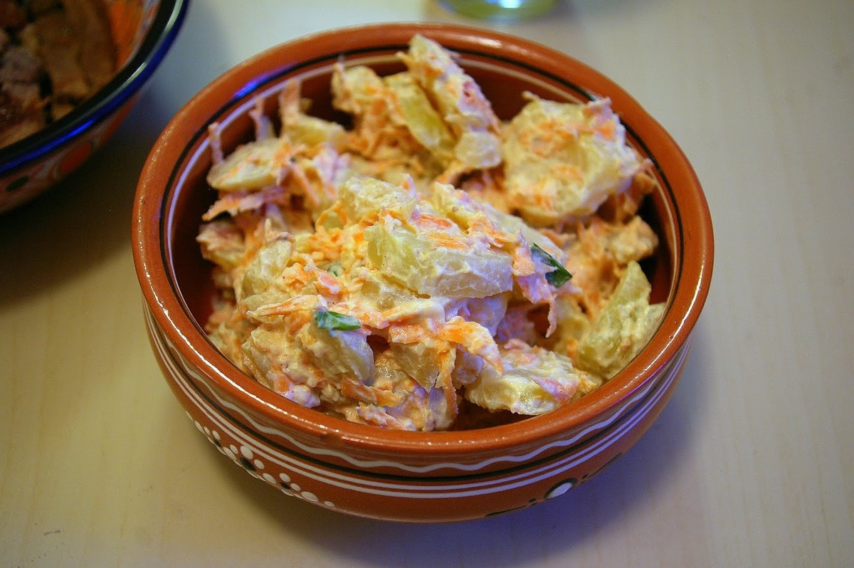 Картофель отварить в мундире, очистить, нарезать кружочками, полить бульоном и дать постоять 10 минут.