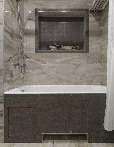 Рассматривая фото ванных комнат, многие обращают внимание, что иногда в обшивке ванной предусмотрен лючок, а иногда его просто нет. Так нужен он или не нужен? И где именно должен располагаться? Исходя из опыта работы, можно сказать, что обязательным условием для устройства такого лючка является наличие гидромассажа в ванной. Есть гидромассаж —значит, есть и мотор, и должен быть доступ для его обслуживания. Лючок доступа непосредственно к сифону ванны нужен для того, чтобы иметь возможность прочистить сифон в случае его сильного засора. Правда, иногда устройством такого лючка пренебрегают, вероятно, руководствуясь мыслью (или опытом), что доступ к сифону ванной может не потребоваться никогда. Действительно, своевременная чистка сливного устройства и правильный уклон, соблюденный при разведении труб, скорее всего, избавят вас от подобных неприятностей. А если они все-таки возникнут, никто не отменял самые распространенные способы устранения засоров — с помощью вантуза и гибкого троса.