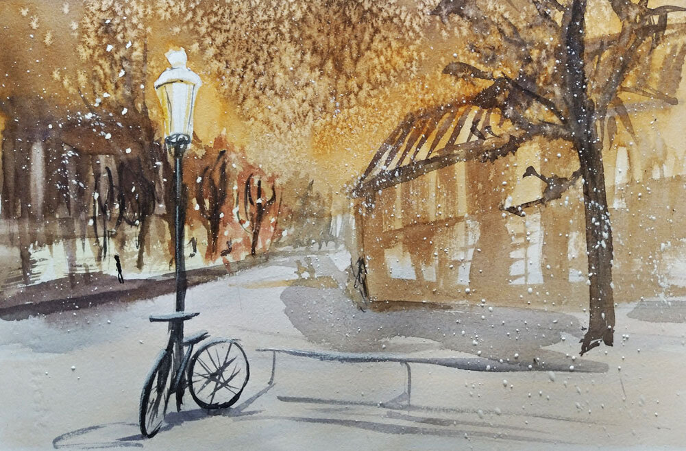 Я очень люблю домики и города…но вырисовывать долго и тщательно – не люблю. Поэтому сегодня я буду немного экспериментировать. Хочется сделать городской пейзаж, но при этом не уходить в детали. А создать легкое вечернее настроение, с огоньками на деревьях и теплым светом вокруг. Я рисую акварелью «Невская палитра»: сиена жженая, фиолетоый, кадмий желтый средний, кадмий оранжевый, сепия, ультрамарин. И передо мной хлопковая бумага Moulin du Roy. Начинаю, как уже сложилось, с наброска. Намечаю линию горизонта и к ней добавляю домики. В центре картины будет велосипед под фонарем. Особо в детали вдаваться я не собираюсь. Первым делом я наношу желтую краску на лист. Это будет теплый свет фонариков. После того, как слой краски высохнет, мне надо нанести маскирующую жидкость. Жду полного высыхания и перехожу к работе. Буду заливать небо, обходя фонарь. Начну с жженой сиены с добавлением фиолетового. Причем чем ближе к линии горизонта – тем светлее оттенок. По сырой краски накидываю соли в
