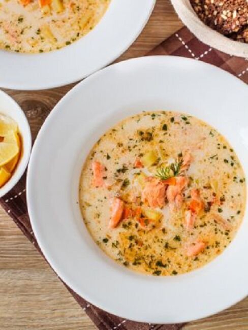 Финский сливочный суп с лососем Наверняка после разделки целого лосося у вас остаётся скелет и небольшие обрезки. Это отличный и простой рецепт их использования для приготовления нежного и вкусного рыбного супа по-фински Ингредиенты на 4 порции: 1) скелет и обрезки 1 лосося (желательно ещё немного филе примерно 150-200 г) 2) луковица - 2 шт. 3) лавровый лист - 2 шт. 4) чёрный перец - 5 горошин 5) морковь - 1 шт. 6) картофель - 3 шт. 7) соль и перец по вкусу 8) тайский рыбный соус по вкусу (можете не добавлять) 9) сливки (9-12%) - 200 мл 10) укроп (зелень) для подачи - 30 г Шаг 1 Рыбные обрезки и кости выкладываем в кастрюлю, туда же добавляем перец, лавровый лист и луковицу (надрежьте её крест-накрест) Заливаем водой (1,2 л), ставим на плиту, доводим до кипения. Уменьшаем огонь практически до минимума и не накрывая крышкой варим в течение 20 минут, периодически убирая пену Шаг 2 Во время варки рыбного бульона мы мелко нарезаем лук, небольшими кубиками режем морковь, картофель , а так