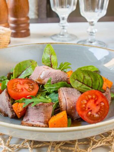 Салат с жареной тыквой и уткой Надеюсь у вас осталось ещё немного тыквы. Потому что я предлагаю вашему вниманию ещё одно блюдо с тыквой. На этот раз вкусный с изящным ярко выраженным вкусом салат, в котором основа - утиное мясо Ингредиенты на 4 порции: 1) филе утиной грудки с кожей - 2 шт. 2) соль и перец по вкусу 3) тыква - 200 г 4) чеснок - 1 зубчик 5) прованские травы - 1/3 ч.л. 6) томаты-черри 200 г 7) микс салатов - 200 г Для приготовления заправки: 1) соевый соус - 25 мл. 2) бальзамический уксус - 15 мл. 3) растительное масло - 20 мл. 4) сахарная пудра - 20 г 5) жареные орехи (миндаль, кешью или фундук) - 25 г 6) чеснок - 1 зубчик Шаг 1 Для начала приготовим заправку. Для этого выкладываем все ингредиенты в стакан С помощью погружного блендера перемалываем и смешиваем все ингредиенты Шаг 2 Кожицу утиного филе надрезаем неглубоко острым ножом. Подсаливаем филе и перчим по вкусу. На предварительно разогретую сухую сковородку выкладываем филе кожицей вниз и жарим в течение 3-4 мину