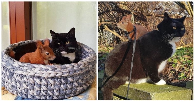 Белка по кличке кот неразлучны с тех пор, как Декан Андерсен принес в дом грызуна. История началась с того, что 38-летний житель Дании нашел упавшего с дерева бельчонка в своем саду. Мужчина выходил зверька, а Тайгер вскоре подружился с ним. История началась с того, что месячный бельчонок упал с высокого дерева в саду Декана Андерсена У детеныша была глубокая рана в груди, а его мама так и не объявилась 38-летний житель Дании принялся самостоятельно выхаживать зверька. В то время у мужчины была кошка Коко и ее брат Тайгер "Как только я принес Тин-Тина домой, Коко тут же стала ласкаться и вылизывать его, а Тайгер вышел на улицу. Когда Тайгер вернулся, он понял, что его сестра приняла Тин-Тина", - рассказывает Андерсен "Через год Коко умерла, и это стало страшной утратой для Тайгера, он искал ее днем и ночью" После потери сестры Тайгер стал привязываться к Тин-Тину "Их самые любимые занятия - прогулки и лазанье по деревьям" Во время приветствия пушистые друзья трутся носа
