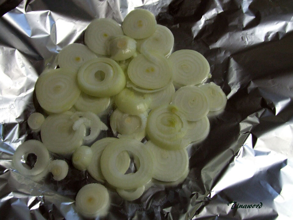 Вырезала два листа фольги. Сложила их на противень в виде креста и стала по порядку на них овощи и рыбу выкладывать.