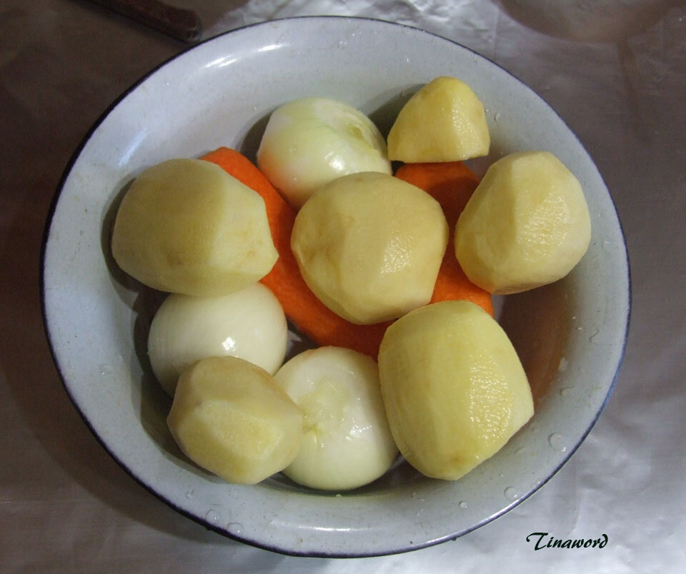 Так я и сделала. Взяла три луковицы, две средних моркови и 5 средних картофелин.