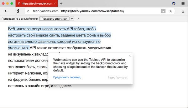 Встроенный переводчик страниц позволяет показывать оригинал, если навести курсор мыши на переведенное предложение. Также вы можете предложить свой вариант перевода.
