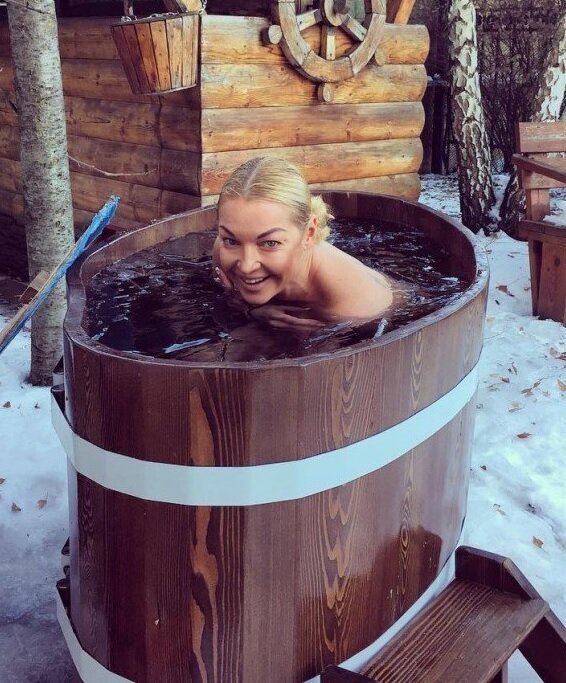 На днях известная прима-балерина, актриса, певица и общественный деятель Анастасия Волочкова на своей странице в инстаграм выложила очень интересные фотографии со своего субботнего отдыха. Прима решила снежный зимний вечер провести в огромной деревянной купели со льдом. Анастасия сняла не только откровенные фотографии в такой локации, но еще и видео, в котором Волочкова с топором рубит для купели лёд, утверждая, что купель без льда, не купель вовсе. Все это действие на глазах многотысячных подписчиков, которые ее увидели в сети инстраграм, где Анастасия находилась абсолютно без одежды, единственное, что прикрывало ее тело перед камерой и в этот снежный вечер, было одно банное полотенце и резиновые шлепанцы и то только до момента окунания в бочку с ледяной водой. От такой импульсивной и неординарной личности, можно было ожидать разного, но, все же, для подписчиков было неожиданно увидеть такой откровенный экстрим. Банный образ примы-балерины, в резиновых шлепанцах с купелью со льдом