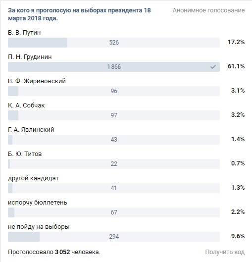 24 января в группе "Мысли О" в вк было начато онлайн голосование по теме: "За кого я проголосую на выборах президента 18 марта 2018 года". И на сегодняшний день результаты такие: Голосование в группе продолжается восемь дней, и за это время в нем приняло участие более трех тысяч человек. На данный момент, уверенную победу в голосовании одерживает П.Н. Грудинин, набравший более 1800 голосов (около 61 %). На втором месте, В.В. Путин. За него проголосовало чуть более 500 человек (около 17%). Еще около 300 человек не собираются идти на выборы (почти 10%). Проинтерпретировать результаты можно по разному. Рассуждения на эту тему можете прочитать в одном из предыдущих постов. Онлайн голосование еще продолжается, поддержите своего кандидата.
