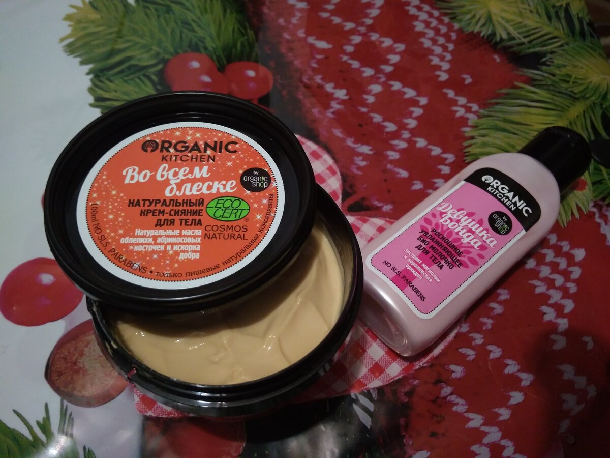 В очередной раз, пока я размышляла над новой статьей, мой взгляд упал на так милые любому девичьему сердцу тюбики-баночки, и тема родилась сама собой. Этот Новый Год у меня был очень щедр на подарки. В числе разнообразных славных безделушек был очень приятный презент от коллеги в виде крема и молочка для тела из популярного магазина Organic Shop. И поэтому сейчас я представляю вашему вниманию небольшой обзор на них. 1.Натуральный крем-сияние для тела «Во всем блеске» от Organic Kitchen. Крем с натуральными маслами облепихи, абрикосовых косточек и «искорками добра». Вообще я крайне придирчива к выбору крема. На самом деле, я не особо даже люблю ими пользоваться. Потому что постоянное ощущение, что я грязная! Серьезно. Вот только вышла из душа чистая и свежая, нанесла крем и…всё. Чувство жирной пленки на теле, липкости. И этот крем наносила с изрядной долей скептицизма. Но на удивление крем очень легко впитался, кожа стала мягкой, действительно увлажненной, а ощущения, будто меня мас