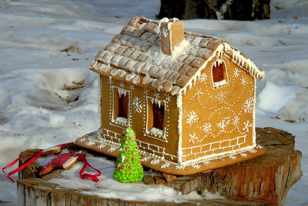 Фотографировала я недавно в парке 50-летия СССР деревья, и увидела на пеньке такой красочный пряничный домик. Почему его оставили на пеньке, не понятно было, может у людей традиция такая:-) Сделала пост у себя в жж, обсудили с друзьями варианты, кто и почему мог оставить домик в парке. Вот такой прелестный домик, много деталей, одна черепица чего стоит:-) А спустя несколько дней ссылку на мой пост на местном интернетпортале увидела хозяйка домика Нина Прохорова и написала мне. "С этого домика три года назад началось моё увлечение имбирными расписными пряниками. Да, да, сделала я его аж три года назад! И тогда ни у кого не поднялась рука отломить кусочек этого пряничного домика и съесть. По вечерам в домике "зажигался свет" (фонарик) и мы любовались им. Праздники закончились и он был упакован в коробку до следующего Нового года. После него было ещё много разных домиков и новогодних и свадебных, но именно с этого зимнего сказочного началось моё творчество. Ну а в этом году уже