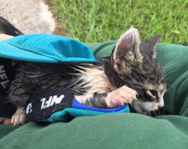 В понедельник поздним утром, после того как ураган Ирма почти закончил проходить через Гейнсвилл, Чед Митчелл решил отправиться к электроподстанции в полутора километрах от его дома. Во время бури электричество вышло из строя и необходимо было осмотреть повреждения. «Когда Чед доехал до угла, где находилась подстанция, то услышал писк. Сначала он решил, что звук исходит от велосипеда, поэтому слез и проверил его. Не обнаружив неполадок, он стал оглядываться», - рассказала Керри Митчелл, жена Чеда. В тот момент, когда мужчина осматривался, он заметил крохотного зверька, лежащего в траве без движения. Это был промокший насквозь котенок. Его передние лапки были раскинуты, а сам он едва дышал. «Чед сначала решил, что котенок был мертв, но затем сообразил, что пищал именно он». Мужчина сразу же вытащил малыша из лужи и положил в свою бейсболку. Всю дорогу домой он прижимал к себе котенка и просил его не умирать. «Чтобы избежать опасности попадания обломков, мы заколотили окна, поэтому в дом