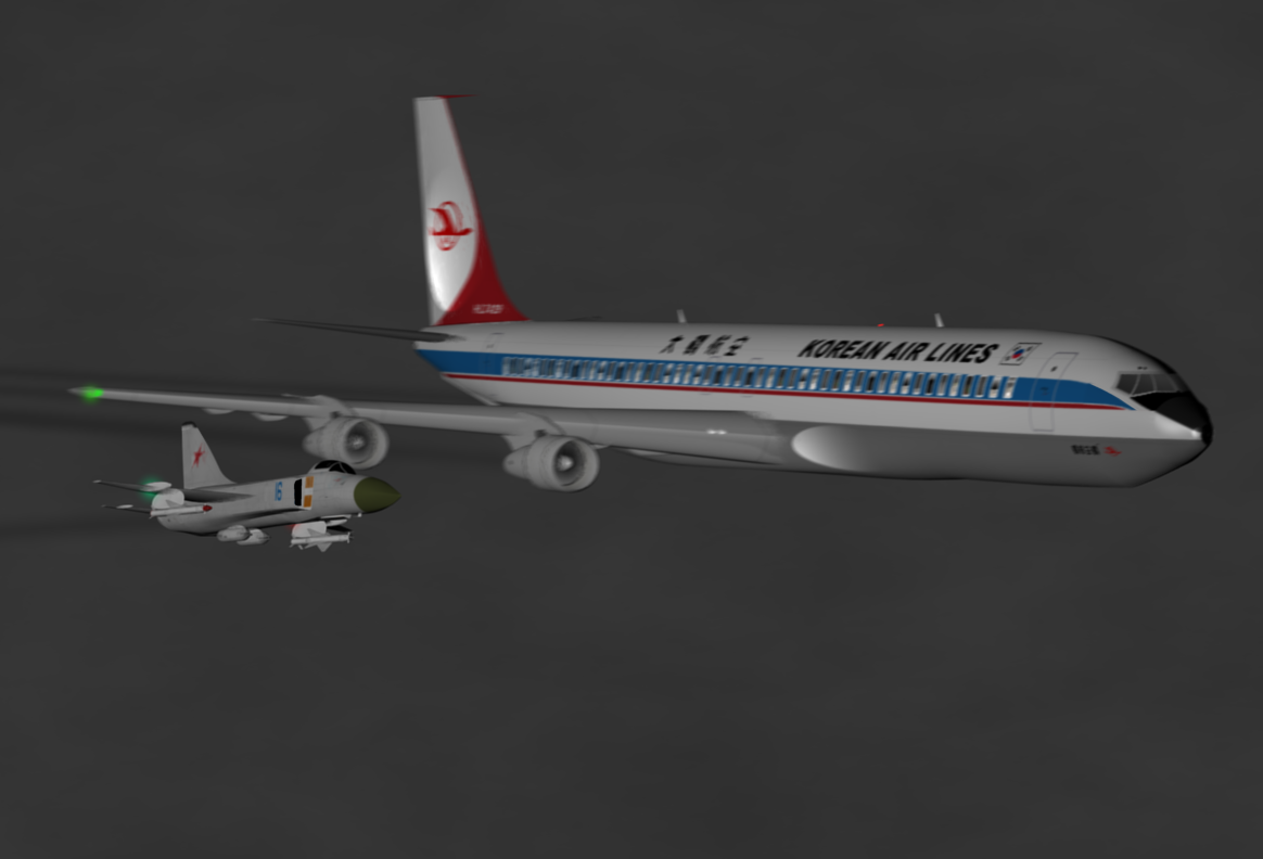 Пилот истребителя Су-15 сближается с корейским самолетом. Видит опознавательные знаки гражданского судна. Советский перехватчик подаёт визуальные сигналы корейскому пилоту: проходит на предельно близкой дистанции, качает крыльями, сигналит бортовыми огнями, указывая направление для посадки на ближайшем аэродроме.