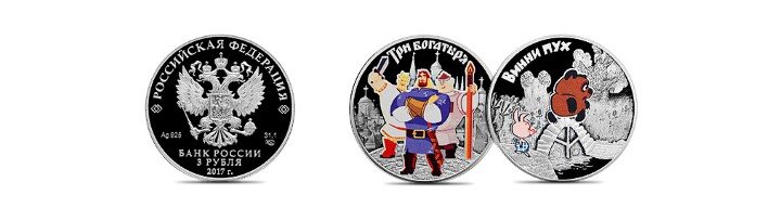 Единственная в истории российской нумизматики серия, выходящая одновременно в трех вариантах - драгоценном, недрагоценном и недрагоценном цветном - пополнится новым экземпляром. К «Винни-Пуху» и «Трем богатырям» (картинка в начале статьи), появившимся в конце декабря, добавится еще один персонаж отечественных мультфильмов, какой - неизвестно. Как и первые монеты серии, эта будет иметь номинал 25 рублей и полумиллионный тираж (50 тысяч - в цветном исполнении), а серебряный вариант - номинал 3 рубля и тираж 3 тысячи штук.