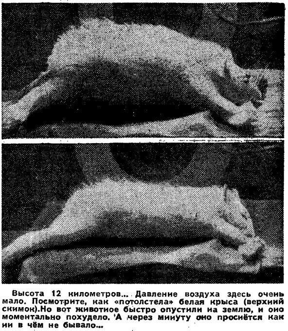 Не так давно «космические доктора» заметили, что по некоторым животным на Земле можно предугадать, как будет влиять Космос на человека. Усадили однажды медведя в настоящее пилотское кресло, застегнули ремни. Кресло поставили на тележку. Раздалась команда: «Приготовиться! Пли!»... Грохот, страшный толчок. Это пороховой патрон «выстрелил» тележку, и она, как снаряд, как ракета, понеслась по рельсам со скоростью звука. Натерпелся страху Топтыгин! Но когда потом его осмотрели, всё оказалось в порядке. — Главное — все кости целы, — сказали врачи. — Значит, и человеку можно стартовать в ракете. Ведь по строению кости поясницы у человека и медведя очень схожи... Потом испытывали Хавронью. Оказывается, у неё кости шеи похожи на человеческие. Учёные пришли к интереснейшим выводам. Жидкость, как выяснилось, защищает тело от перегрузки лучше любой брони. Это предсказывал ещё Константин Эдуардович Циолковский. Но кто сможет жить в жидкости? Рыбы. Гуппи — рыбка с ученическое перо; очень нежная. И а