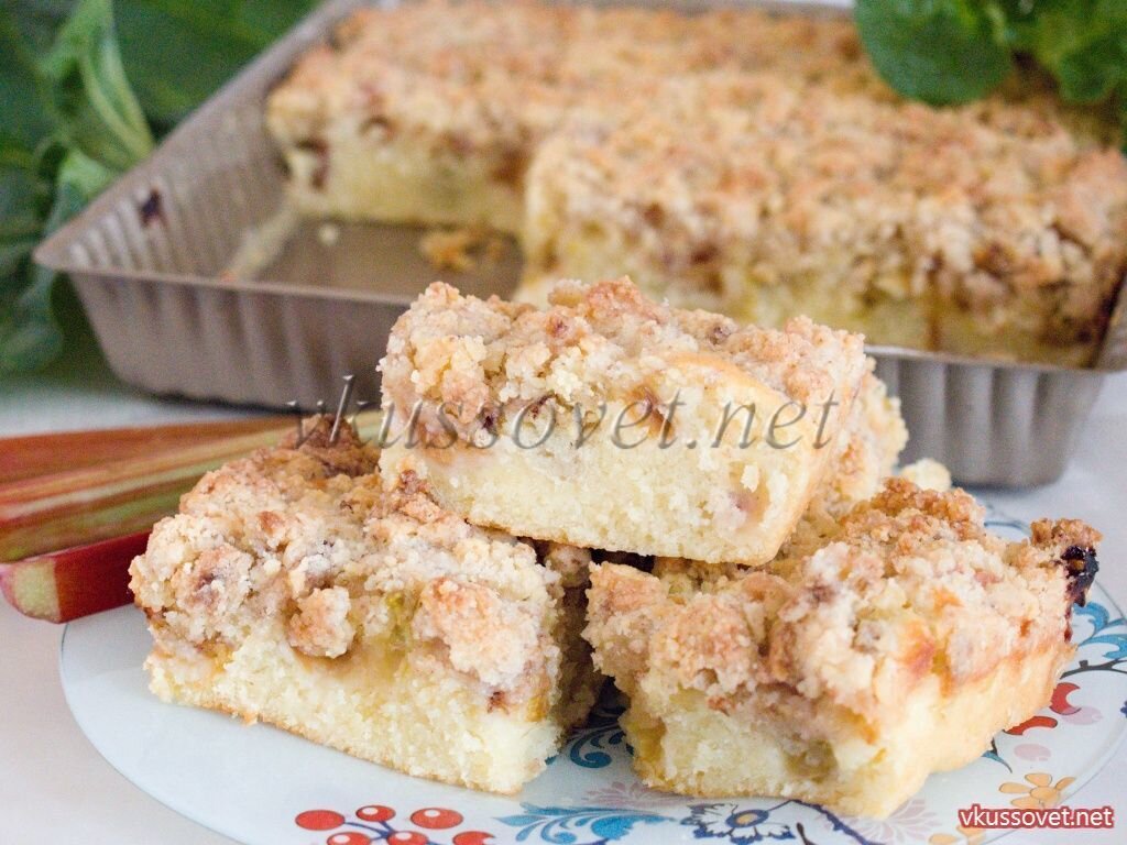 Рецепт приготовления пирога из стеблей ревеня со штрейзельной крошкой. Весной на участке начинают появляется первые зеленые «витаминки», и, пожалуй, самым полезным, долгожданным – конечно же ревень. Из него можно приготовить очень много полезных, вкусных блюд и заготовок: кисель, варенье, пастилу, пироги и т.д. Предлагаю на заметку один из быстрых и простых пирогов с ревенем. Он готовится слоями из двух разных по консистенции и структуре видов теста, а между ними кусочки ревеня. Пирог получается по вкусу сладко – кислый, нежный с хрустящей корочкой. В качестве дополнительных ароматизаторов можно использовать – ваниль, корицу, мускатный орех, гвоздику и т.д. Такой пирог очень хорошо сочетается со сладким чаем, холодным молоком и шариком мороженного. Необходимые ингредиенты: для начинки: - 220 – 250 г. ревеня; - 1 ст. ложка сахара; - 1 ст. ложка крахмала. для штрейзеля: - 120 г. сахара; - 1 ч. ложка корицы; - щепотка соли; - 120 г. сливочного масла (растопленного); - 240 г. му