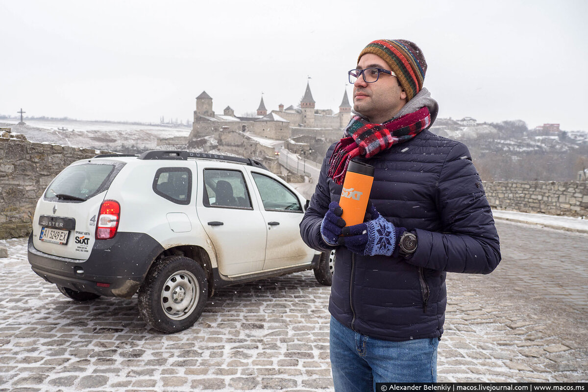 4 Автомобиль выбирал, учитывая качество украинских дорог: полный привод был обязательным условием. Обычно я стараюсь брать самые маленькие и дешёвые машины, но это не тот случай. Достался Renault Duster, который все обычно хают, а мне он наоборот очень симпатичен. Да, не самый комфортный, зато неубиваемый и проходимый. А ещё дизельный. С прокатом всё было чётко, заполнили документы, осмотрели машину и пожали руки. В машине лежал фирменный оранжевый пакет с новогодними подарками (дело было 4 января) — термос и блокнот пришлись очень кстати.