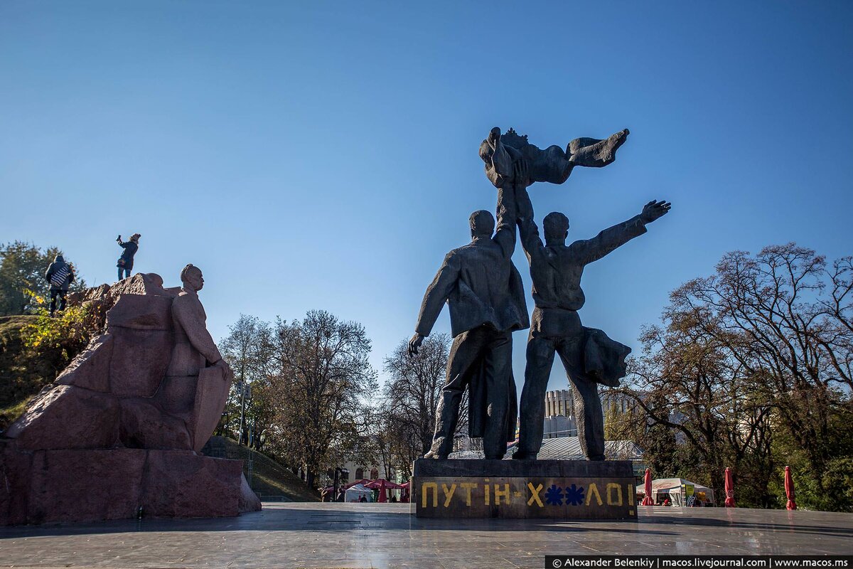41 Это Памятник воссоединению Украины и России, построенный ещё в советские годы. Он стоит, и никто не собирается его сносить. Только подпорчен вандалами: во время зимних событий, кто-то написал всё те же шесть букв с одним дефисом. Можно как угодно относиться к Путину, но уродовать свой же собственный город – нехорошо. И киевляне, с которыми я говорил, с этим согласны. Теперь дело за властями, приведут ли они его в порядок.