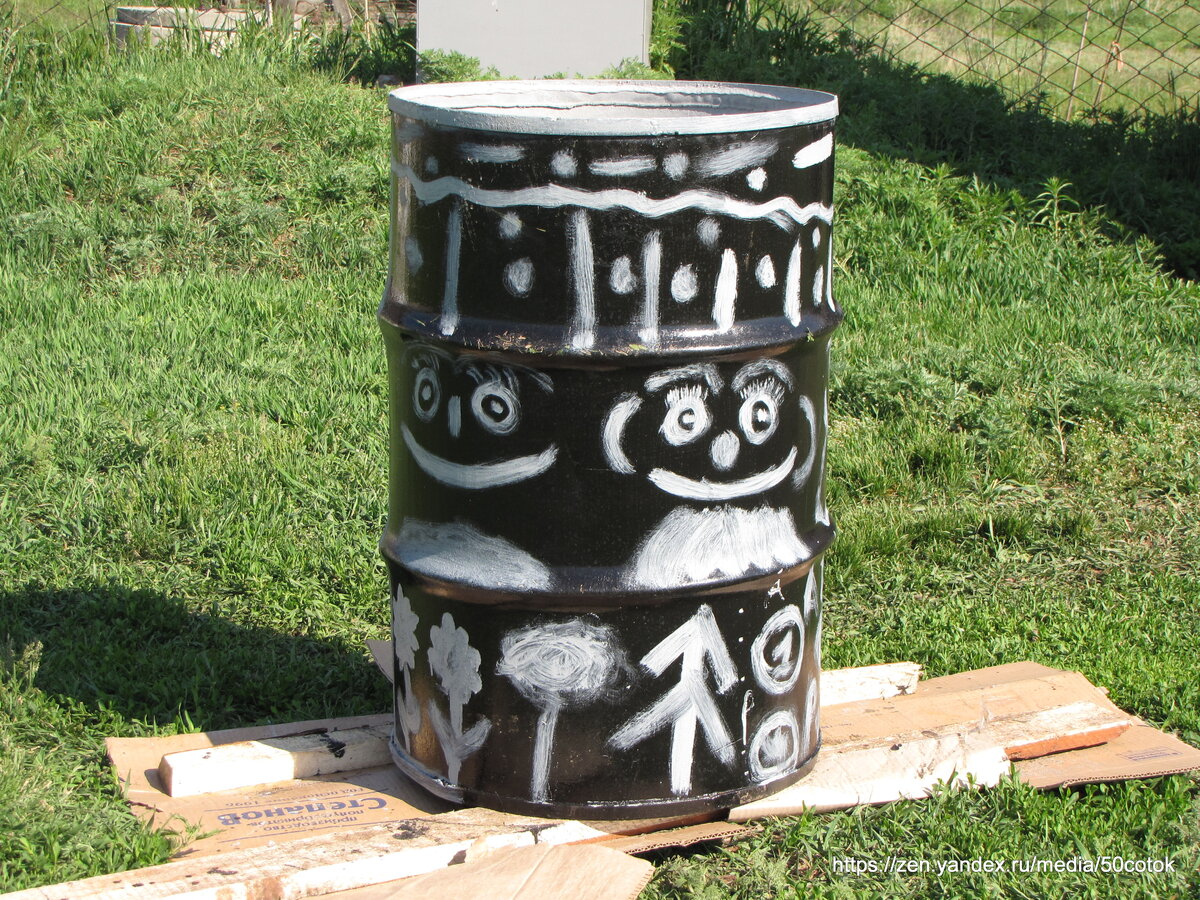 Уличная бочка заржавела вся. Купил черной и белой грунтовки. Предложил доче её разрисовать. При условии покраски всей бочки. Внутри белой, а снаружи черной - чтобы нагревалась быстрее на солнце. Через пятнадцать минут у нас уже было трое её знакомых ребятишек, которые в драку по очереди красили бочку. Получились какие- то индейские мотивы. Теперь "маленькие маляры" страшно гордятся своей работой.