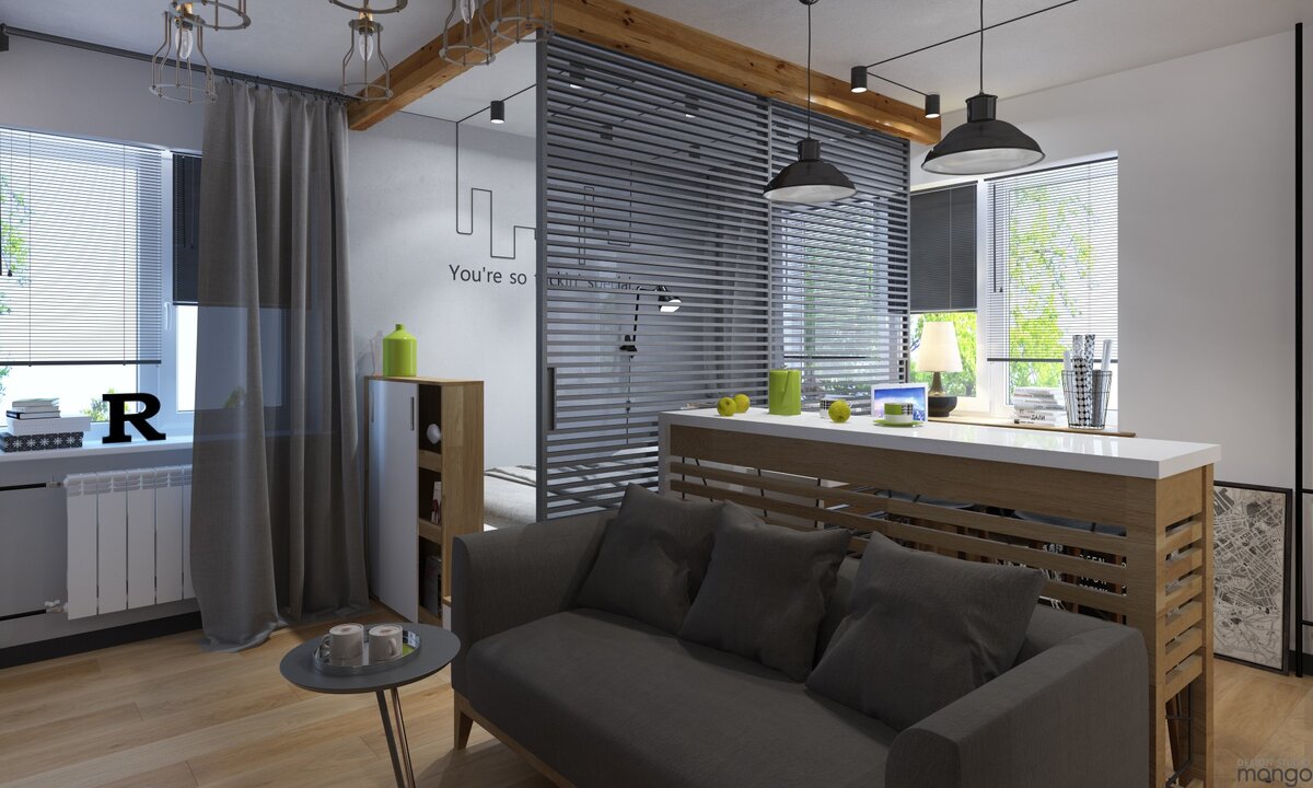 Реечная перегородка, за которой скрывается спальня, раздвижная. При необходимости пространство для сна можно сделать приватным или частично открыть. Сдвинули дверцы в одну сторону – и можем использовать кухонный стол, чтобы поставить ноутбук и поработать прямо в постели. Сдвинули в другую – смотрим телевизор в гостиной прямо из кровати.