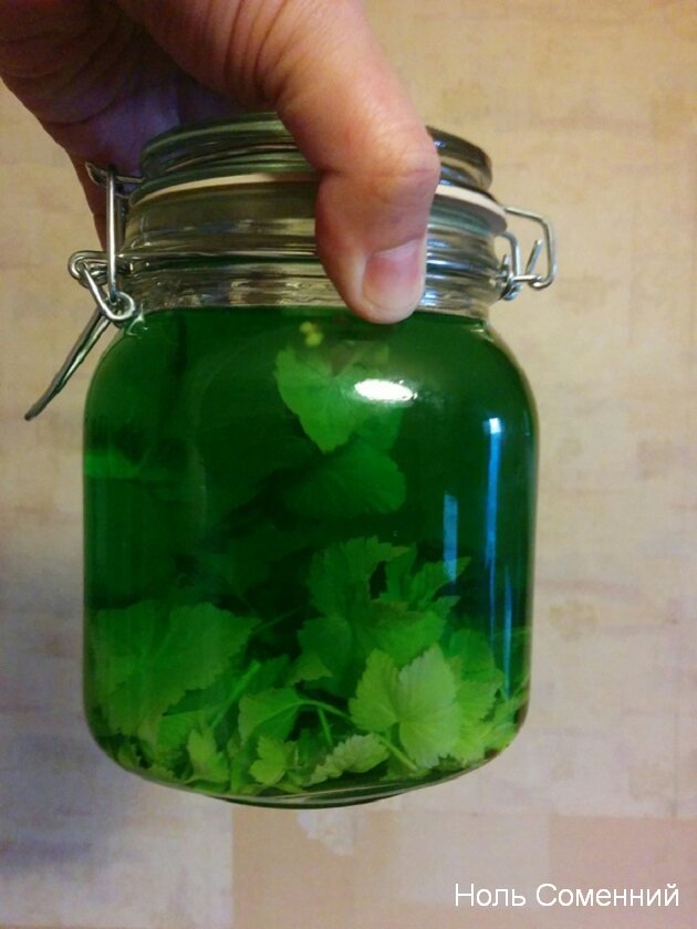 Сегодня я хочу вам предложить один рецепт настойки на водке или самогоне, который мне рассказал еще мой дед! Отличается данный рецепт своей безумной простотой и очень хорошо поднимает иммунитет! Надеюсь вам этот рецепт понравится своей простотой, и так что же нам понадобится? а понадобится нам следующее: листья смородины бутылка водки или самогона Я беру естественно самогон, но бывают такие случаи когда вариантов нет! Вам приходится покупать водку, и тогда это рецепт тоже для вас! Всё что нам с вами надо сделать, это положить листья смородины банку. здесь действует единственное правило что листья смородины должны закрыть примерно треть банки. Если вы взяли банку трехлитровую берете соответственно и побольше листьев смородины. Треть баночки листьями смородины загружено и выливаем сюда наш самогончик или водочку крепостью 40 градусов. Ну вот прекрасно! свободного места для воздуха практически нет, закрываем крышечкой и отправляем на две недели в темное теплое месте и два раза в день у