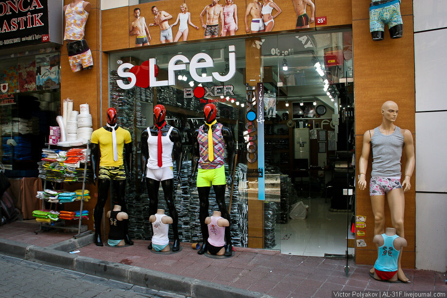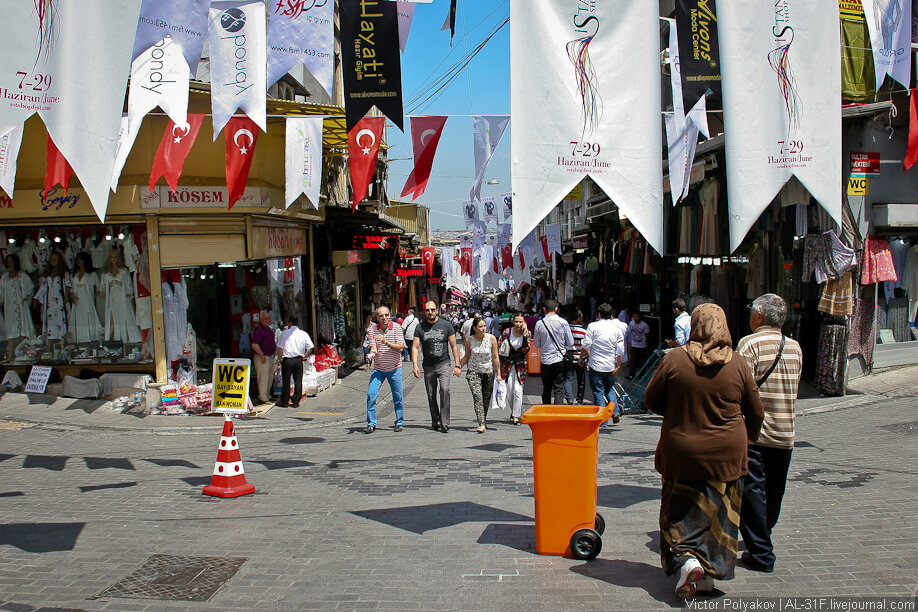 Давайте прогуляемся по стамбульским улицам. В старом городе практически все улицы по совместительству являются рынками. Причём, всяческая сувенирная продукция на улице может стоить в несколько раз дешевле, чем в крытом рынке. Закупились сладостями, можно готовиться к отъезду. Всюду продают жаренные каштаны. А если свернуть с улицы во двор, то там тоже можно найти много интересного. Причем, не только в Стамбуле. Вот, например, московский дворик. Это мы на метромосту. Вид в одну сторону. И в другую. Сейчас заглянем на настоящий рынок. Здесь по сути те же улицы, только перекрыты крышей. Внезапно случилась пятничная молитва, все продавцы и покупатели отложили свои дела. Какое-то "ватное" чучело. Указатель намекает на то, что пора домой. Вот, наши друзья на "Седове" уже собрались и поплыли туда, где их не знают, где их ждут. Сейчас можно расслабиться, отдохнуть немного на газончике у центрального фонтана, взобраться высоко-высоко в кафе и выпить чашечку чая, любуясь безумно красивым горо
