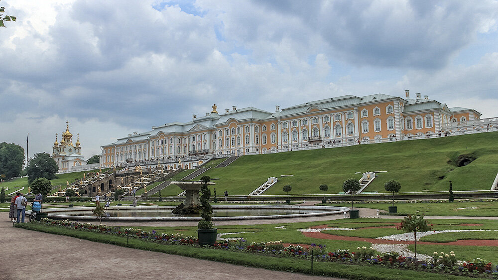 Первая резиденция в Петергофе появилась в 1705 году, это был путевой дворец по дороге на остров Котлин (где сейчас Кронштадт). Справа и слева от дворца стоят флигели, связанные с ним крытыми галереями. Восточный флигель - это Петропавловская церковь, построенная при Елизавете Петровне. Церковь впервые была освящена 10 сентября 1751 года, второй раз, после реставрации, 12 июля 2011 года. В зале представлены элементы церковного облачения XVIII века.