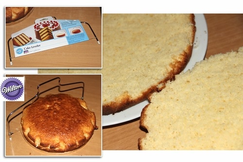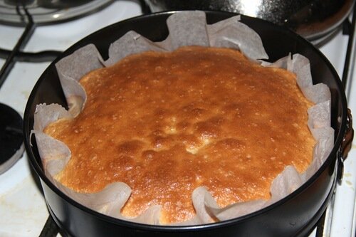 Мы намеренно сделали торту не ровные края. Для большей фактурности. После выпечки даём немного остыть в форме. Затем освобождаем готовый пирог от формы и бумаги и охлаждаем полностью. Разрезаем на два пласта сп
