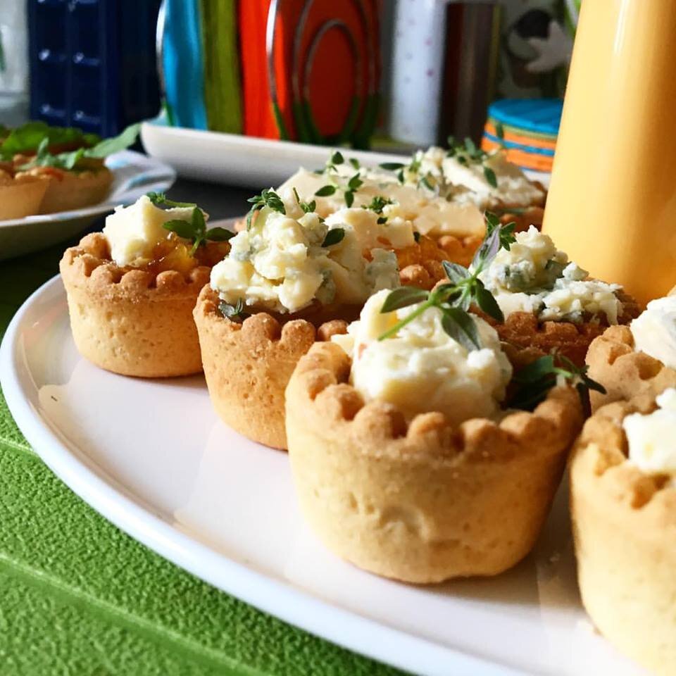 Поговорим о тарталетках. Они бывают сладкие и несладкие. Их можно испечь самостоятельно или просто приобрести в магазине. Но главное, их очень удобно наполнять различными закусками на любой вкус. Расскажу о нескольких вариантах моих любимых начинок. Тарталетки с апельсиново-лимонным конфитюром и голубым сыром На дно тарталетки положила чайную ложечку конфитюра, а сверху кусочек голубого сыра, затем украсила веточкой тимьяна. Сочетание вкуса просто замечательное. Конфитюр отлично гармонирует с сыром и подчеркивает его характерный островатый оттенок. Можно попробовать поменять основу тарталетки на грушевый конфитюр. Вкус будет более сладковатым, но также отлично подойдет для сыра. Мне понравились оба варианта. Тарталетки с творожным сливочным сыром, копченым лососем и рукколой Наполнила кулинарный мешок сливочным сыром, отрезала носик и наполнила тарталетки небольшим количеством сыра. Сверху положила по ломтику лосося и по листику рукколы. Лосось всегда хорош в паре со сливочным сыром, а
