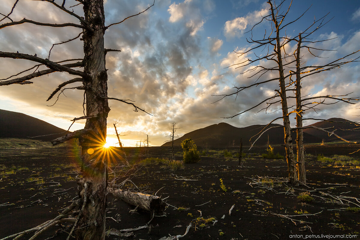 2. Мертвый лес на склонах Толбачика именно такое место. Прошло уже больше 40 лет после извержения, уничтожившего тайгу, и жизнь снова расцветает между призрачных деревьев. Это драматическое место появилось во время извержения в 1975 году, когда тучи шлака и пепла засыпали таежный лес. Многометровый слой вулканической пыли укрыл тогда огромную часть леса, и вся растительность погибла именно из-за ее абразивного воздействия извне. От зеленых деревьев после изв