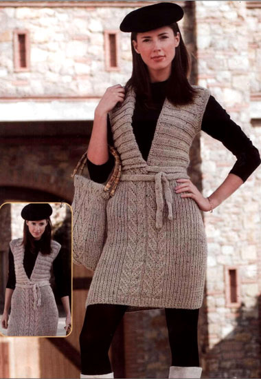 Для второго пояса перевести на спицы отложенные 8 петель правой части горловины, связать 80 см двойной резинкой и закрыть все петли трикотажным швом.