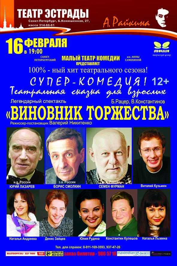 16 февраля в 19.00 в театре Эстрады им. Райкина Супер-комедия в 2-х действиях с одним антрактом. По пьесе Б.Рацера и В.Константинова «Виновник торжества». Этот легендарный спектакль идёт с неизменными аншлагами в течение многих лет и по праву считается одной из лучших петербургских комедий!