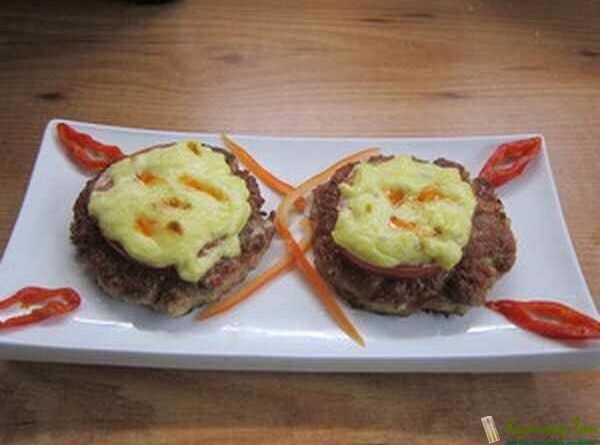 Смешиваем сметану с майонезом 50/50 и добавляем тёртый сыр. Сметанную «шапку» выкладываем на кольца помидора, которыми потом накрываем котлеты. Доводим котлеты в духовке/гриле до готовности(5-7 мин). Приятного аппетита!