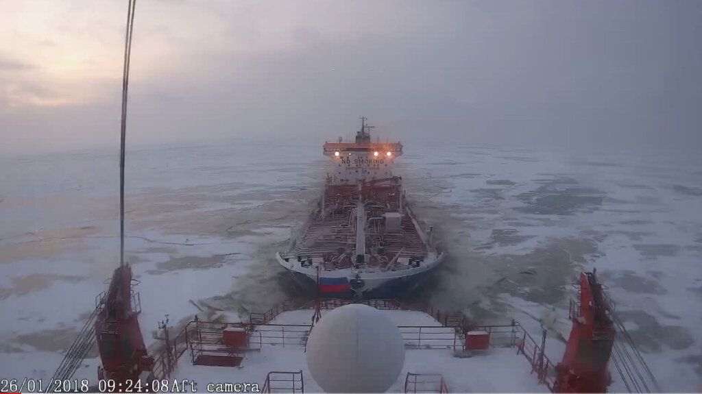 Фото — скрин шот видео, снятого ВЭБ камерой, установленной на носу ледокола «50 лет Победы».