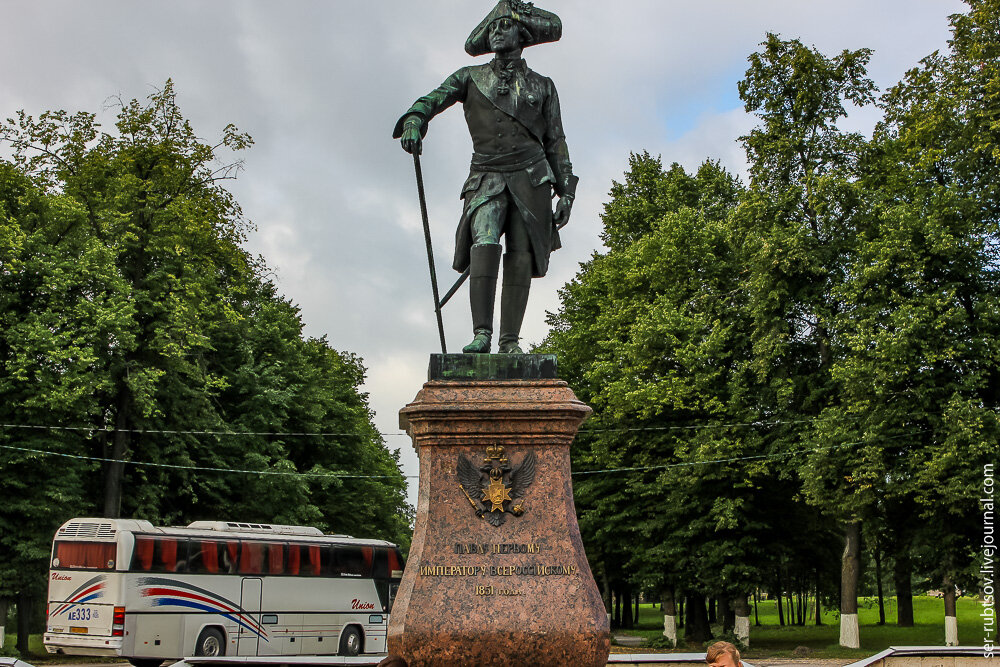 Гатчинский дворец начали строить в середине 18 века для графа Орлова, который являлся фаворитом Екатерины II. Есть мнение, что дворец должен был стать подарком графу за помощь в организации дворцового переворота. Только Орлов недолго прожил в только отстроенном дворце, и императрица подарила его своему сыну – Павлу I. Именно его памятник и встречает нас на подходе. Сам дворец по своему мрачному внешнему виду дворец явно напоминает европейский средневековый замок с присущими ему атрибутами и облицовкой камнем. Статуи возле центрального входа: Внутри стоят макеты дворца, можно посмотреть и оценить всю архитектурную задумку: Птичка :-) Аванзал: Мраморная столовая: Для чего в столовой статуя голого мужика остается загадкой))) Тронная Павла I украшена огромными картинами: В подсвечнике стоят современные свечки: Трон императора: А это тронная императрицы Марии Федоровны, тут картины скромнее размером: А вот здесь императрица спала (возможно и не одна): Одно слово - богато: Белый зал: На бал