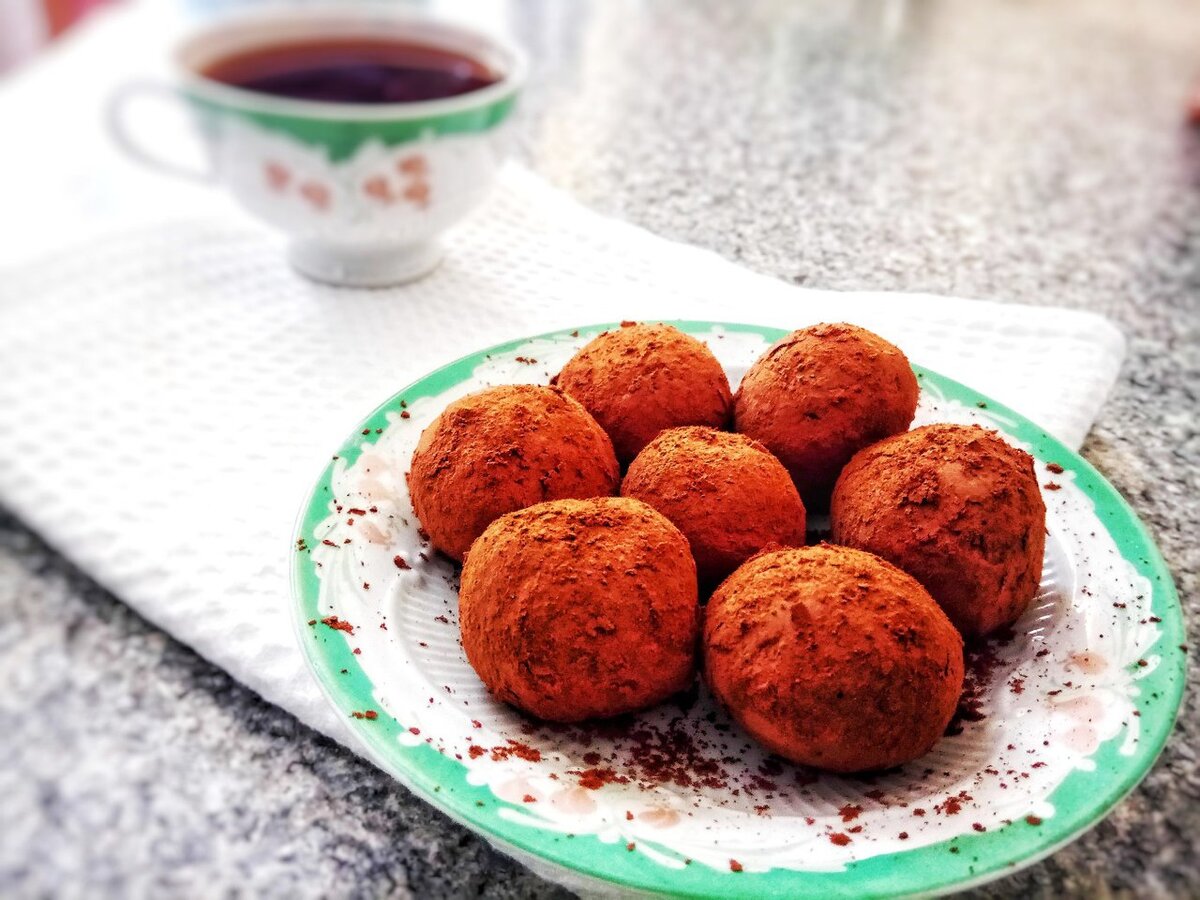 Это не гриб! А сладкая конфета из ганаша глазированная в расплавленном шоколаде и обваленная в какао. Простой десерт, простой рецепт. Погнали по ингредиентам: 500 г тёмного шоколада 250 мл максимально жирных сливок 50 мл вкусного алкоголизма (коньяк, виски, ром) 1 ст.л. сливочного масла 1 пачка какао Шаг 1 Плавим шоколад. Можно на водяной бане, а можно и в микроволновке. Шаг 2 Главное не перегреть шоколад. И нагревать его равномерно. В микроволновке это низкая мощность. Каждые 1,5 минуты доставай и перемешивай, пока шоколадная масса не станет температуры 45 градусов. Определить это легко. Шоколад станет горячим, но не будет обжигать тыльную сторону руки. Шаг 3 Теперь разогреваем сливки до 70 градусов. Показатель - легкий пар от сливок. Но кипеть им никак нельзя. Пора всё перемешать. И получить тот самый ганаш. Шаг 4 Ни один трюфель не обходится без алкогольной нотки. Так что смело льем виски прямо в ганаш, только не водку, нет нет... И снова всё перемешиваем. Для более однородн