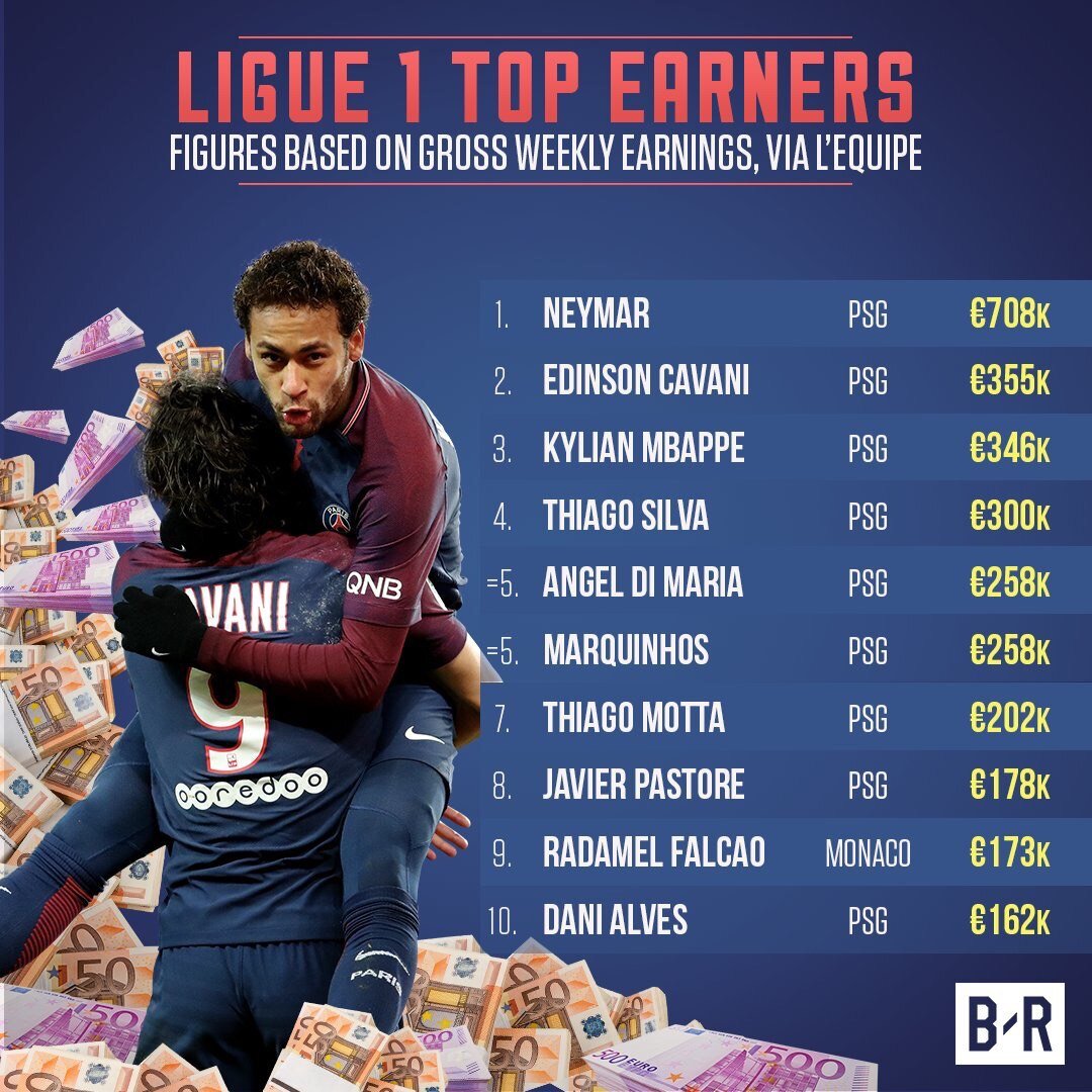 L’Equipe: Неймар получает 3 миллиона евро в месяц, в топ-10 самых богатых парней Лиги 1 – 9 из «ПСЖ»