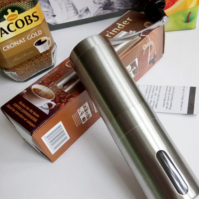 Экспрессо, капучино, или, может быть латте? Какой кофе любите вы? Сегодня будет обзор на такой несколько необычный в наш техногенный век предмет, представляю вашему вниманию кухонный комбайн, работающий без розеток и проводов, да и вообще без электричества, он приводится в действие первобытной мускульной силой, встречайте, это она, ручная кофемолка! Скажу сразу, моё мнение может быть слегка субъективным, этот замечательный девайс выменял Младшенький за монетки в мобильном приложении Алиэкспресс, поэтому отношение к нему соответствующее, скорее, как к подарку, а не к полноценной покупке за свои кровные. Устройство нам понравилось, а почему бы и нет, со своей задачей справляется на ура, выполнено довольно качественно, смотрится на кухне очень даже гармонично и не занимает много места. На каждый день кофе мы любим, как я думаю, и большинство из вас, покупать уже готовым, или молотый, или растворимый, у нас всегда имеется оба варианта, по нескольку сортов. А вот свежемолот