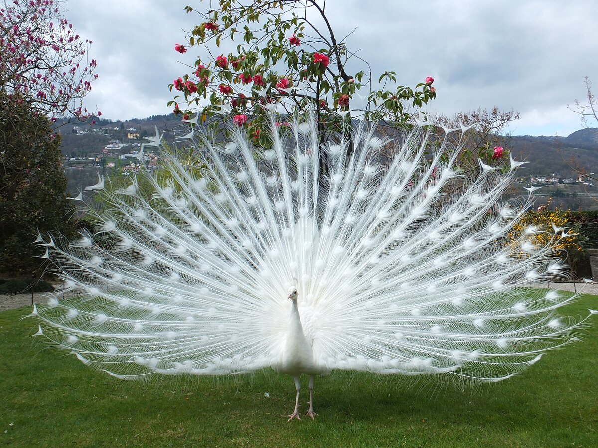 Белый павлин - удивительной красоты птица. Хотя павлины одомашнены более трех тысяч лет назад, белая разновидность была обнаружена сравнительно недавно - в XVIII веке. Белый цвет оперения - это всего лишь вариация окраса. Многие думают, что эти павлины - альбиносы, однако это не так. У альбиносов глаза обычно красного цвета из-за отсутствия пигмента, а у белых павлинов синие (у самцов) или голубые (у самок). Таким образом, это всего лишь разновидность окраса этих удивительных птиц. Павлины относятся к семейству фазановых, и их ближайшими родственниками, как ни странно, являются фазан и курица. Роскошным хвостом обладает только самец, а самочки меньше размером и их хвост ничем не примечателен. Именно в брачный период самец распускает свой хвост, который в высоту может достигать 1,5 метра над землей. На конце каждого пера имеется глазок. В другое время увидеть роскошный хвост павлина можно, только если он будет сильно разозлен. Взрослый самец довольно крупного размера. Он имеет длин