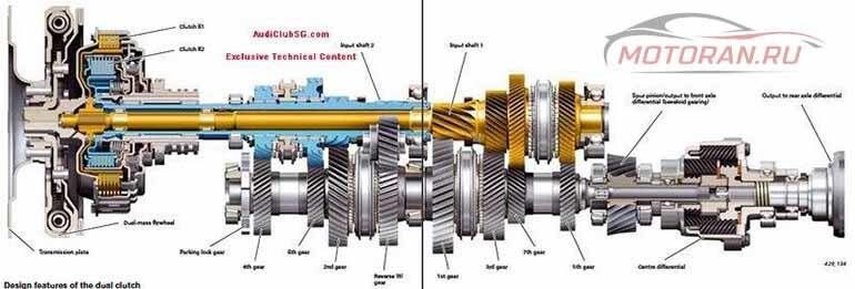 - Благодаря двойному сцеплению, коробка держит включенными одновременно две скорости.